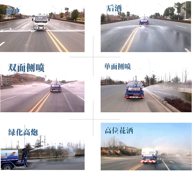 具有前冲、后洒、侧喷(更换喷头后变为侧花洒)、后置式工作平台(带踏梯,四周有安全护栏)、平台上设置有高压水炮(可360°旋转,可调成柱状,**大射程28米;也可调成雾状,**大射程14米,可连续调成:直冲状、大雨 、中雨、小雨、毛毛雨),整车洒水宽度大于14米。配备优质大功率专用洒水泵,取力器,杂物过滤网,国标通用65型消防接口(可通过消防栓加水 )、1套自流球阀系统(可自吸自排,**大吸程6.5米),2根引水钢丝胶管(带阴阳快速接头),配锁,水位计,作业高音喇叭。两侧及后加强型保险杠,防滑爬梯,胶管储存筒。