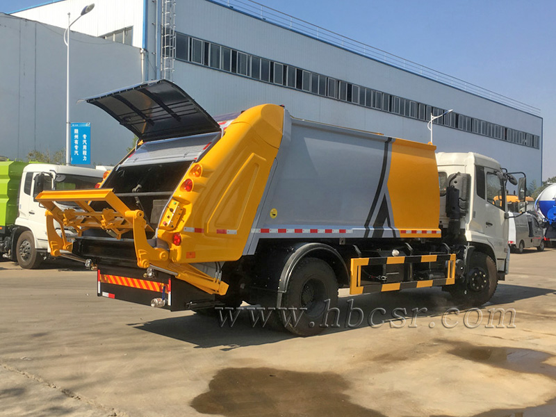 厢体材料为优质锰钢,厚度为边4底5,厢体容积:12-14立方米。由装料机构、压缩机构、卸料机构、油泵、油箱、**阀等组成的液压机构组成。装料机构由支架、连杆机构、凸轮、挂钩等组成,在油缸作用下,将垃圾桶内的垃圾自动翻转倒入料斗内。通过刮板进行破碎压缩,滑板带动刮板将压缩后的垃圾装入车厢内。待车辆到达垃圾填埋场内,液压举升后部垃圾填充器,使推铲向后运行,直**将垃圾全部推出厢体,完成卸料工作。