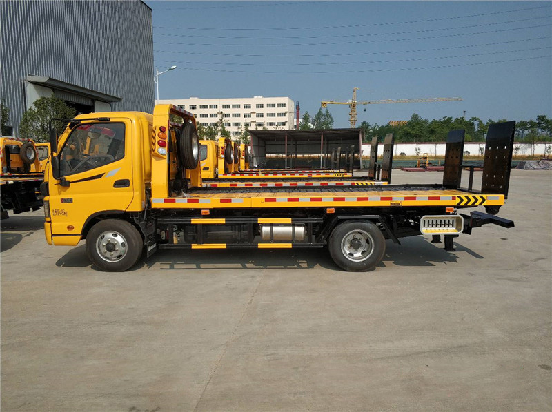 底盘采用福田欧马可,底盘型号BJ1049V9JD6-A3, 4X2驱动,轴距3300,康明斯129马力发动机,5档变速箱,7.00R16钢丝胎,板长4.2米,板宽2.3米,带伸缩板或者翻转板,3P2A折叠冲压平板,一拖二型,双侧联动操作装置,后工作灯3只,1个40KN液压绞盘(25米钢丝绳),1个工具箱,1个洗手箱,2个小拖车,L型抱胎架1对,4根捆绑带,托叉1对,托叉座1对,链钩1条。